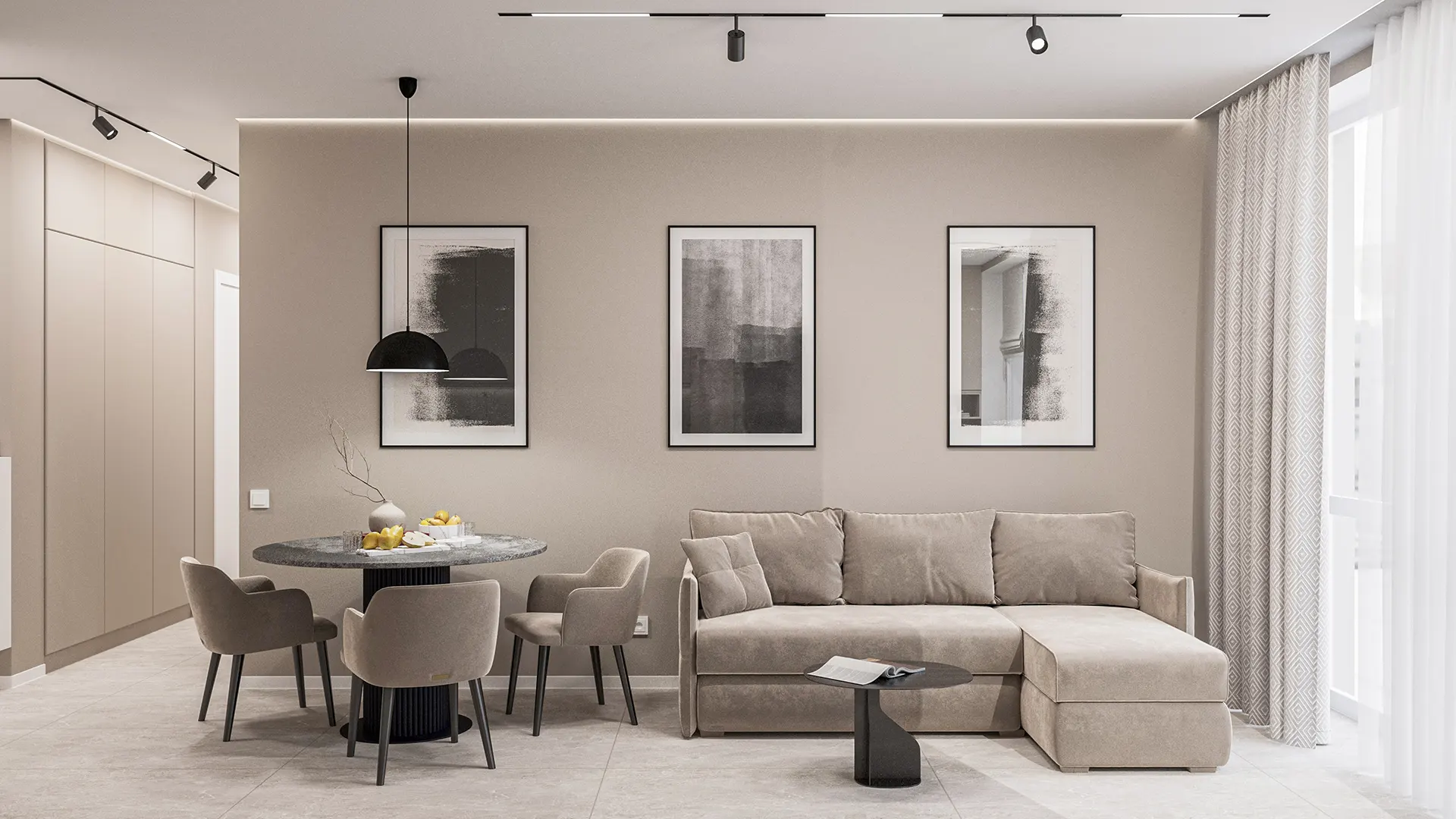 Цей сучасний дизайн квартири вирізняється лаконічністю форм і теплою нейтральною палітрою: у зоні вітальні та обіду поєднані м’які бежево–пісочні відтінки, натуральні фактури й мінімалістичне...