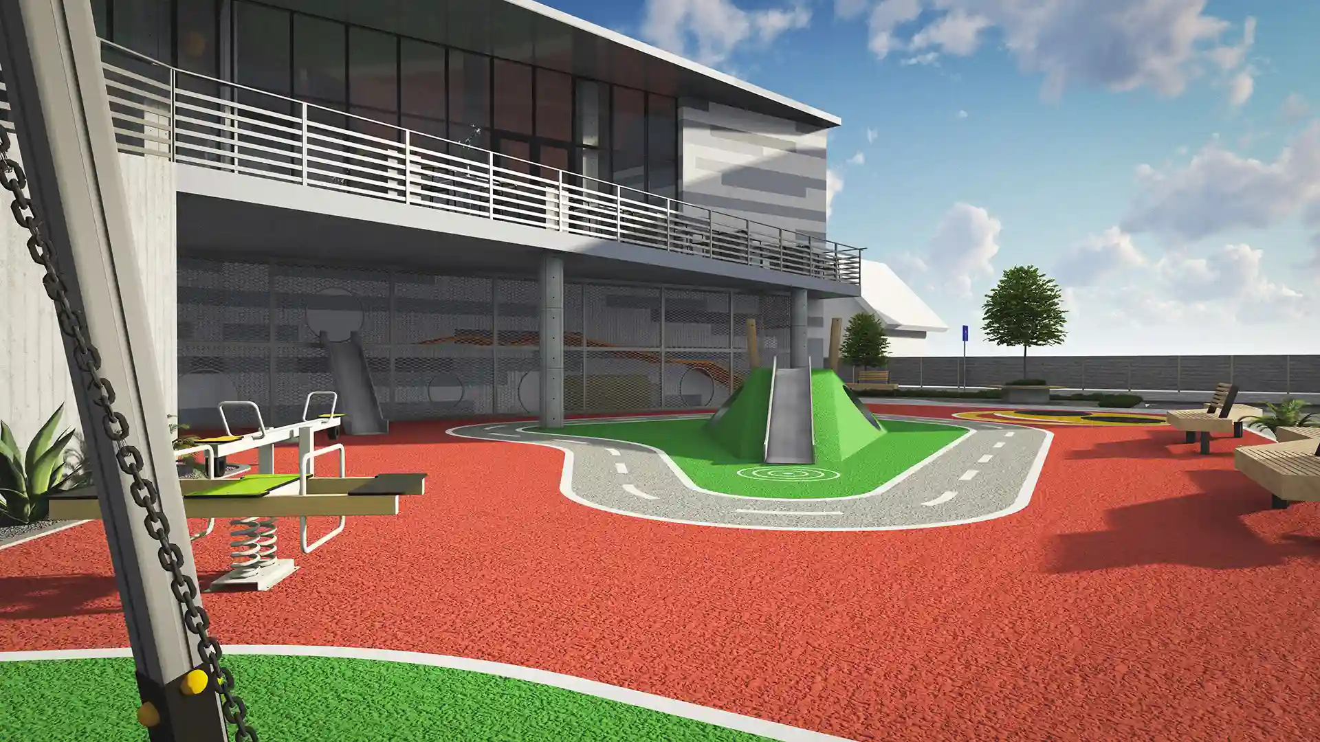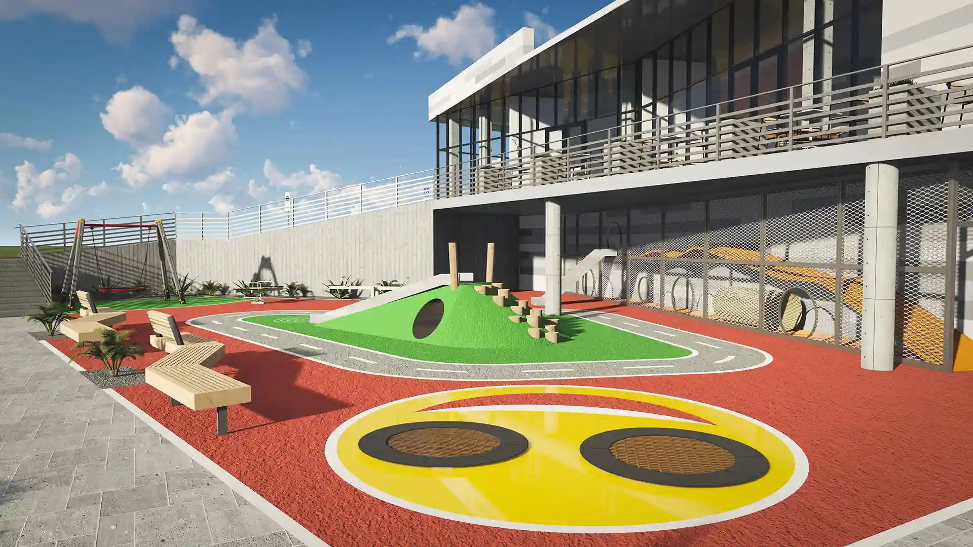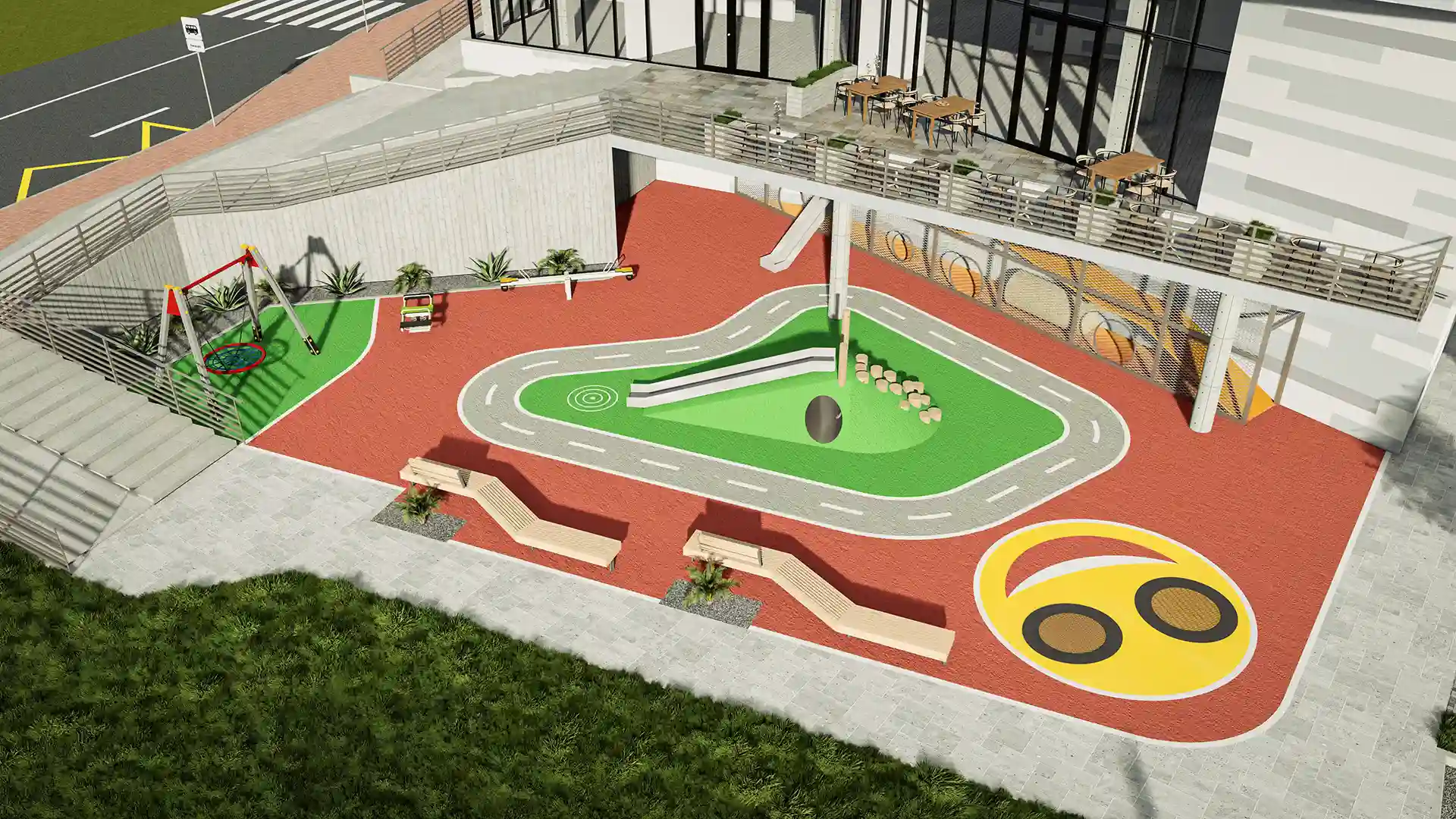 Простір біля входу вирізняється продуманою зонуванням та сучасним озелененням. Широкі сходи плавно переходять у пішохідну терасу з міцної клінкерної плитки, доповнену низькими рампами й тактильною плиткою для безбар’єрного доступу. Під терасою облаштовано дитячий майданчик із безпечним гумовим покриттям, гойдалками та гіркою‑тунелем у формі міні‑доріжки. Зони відпочинку виділено дерев’яними лавками і контейнерами з декоративними рослинами. Над головами прокладено затишне стрічкове освітлення, яке створює атмосферу камерності та безпеки в будь‑яку пору доби.
