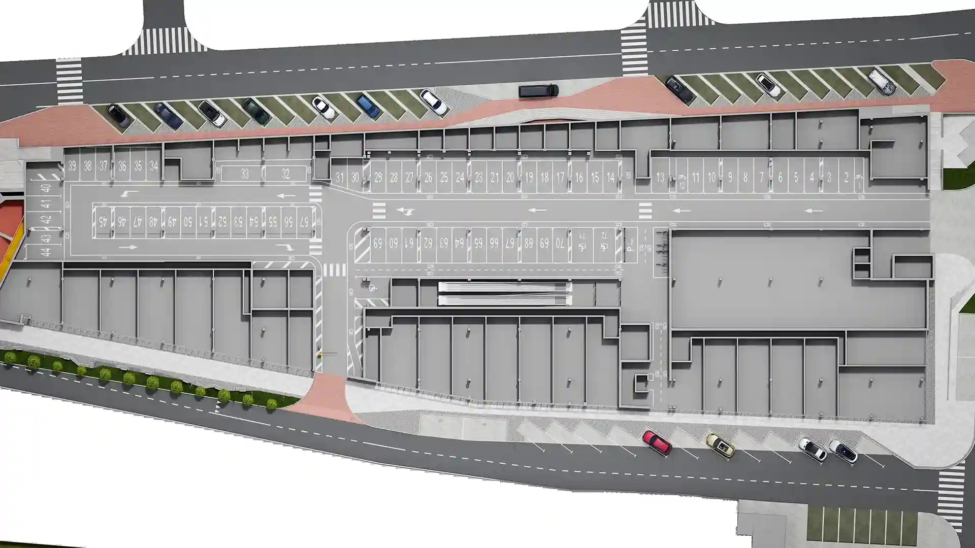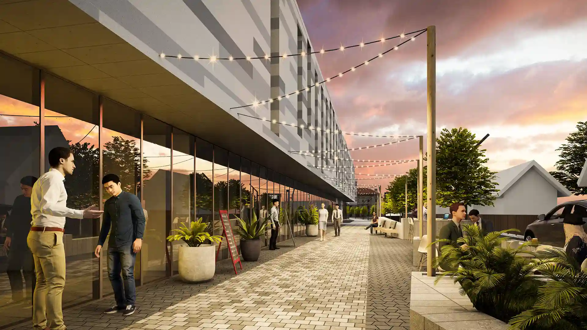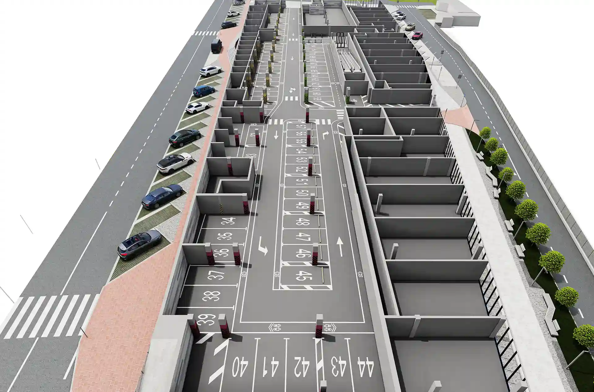 Простір біля входу вирізняється продуманою зонуванням та сучасним озелененням. Широкі сходи плавно переходять у пішохідну терасу з міцної клінкерної плитки, доповнену низькими рампами й тактильною плиткою для безбар’єрного доступу. Під терасою облаштовано дитячий майданчик із безпечним гумовим покриттям, гойдалками та гіркою‑тунелем у формі міні‑доріжки. Зони відпочинку виділено дерев’яними лавками і контейнерами з декоративними рослинами. Над головами прокладено затишне стрічкове освітлення, яке створює атмосферу камерності та безпеки в будь‑яку пору доби.